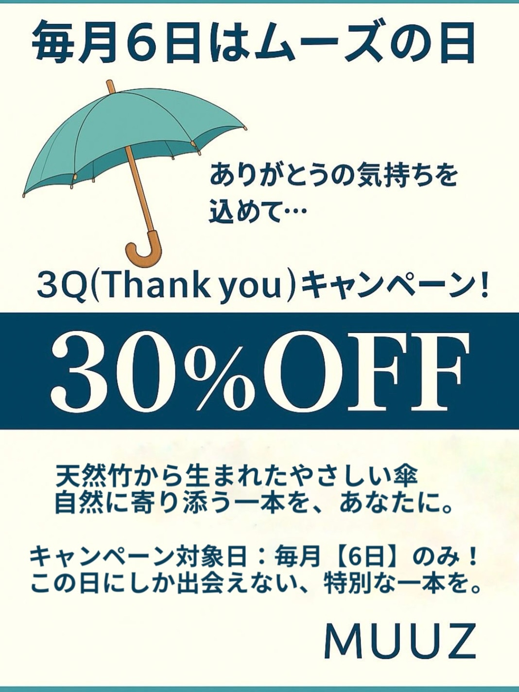 MUUZ傘を 30%OFF にてご提供いたします。